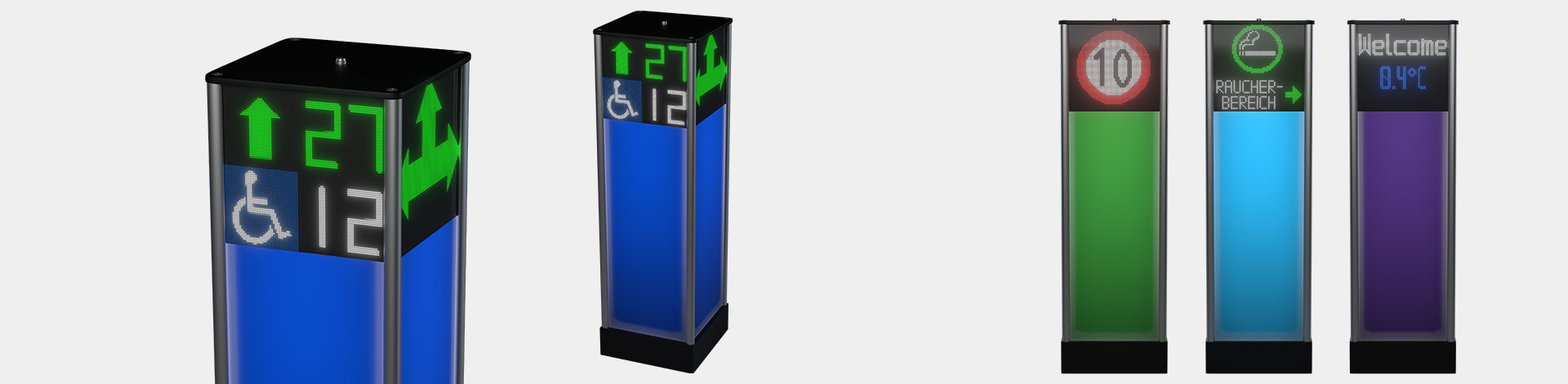 Die vierseitigen variablen LED-Matrixanzeigen dienen zur Darstellung von Texten, Symbolen, Zahlen, Pfeilen oder als Hinweistafel, um zum Beispiel eine schnelle Verkehrsregulierung zu ermöglichen. Die aktuellen Parkplatzinformationen werden über eine serielle/Ethernet Schnittstelle an die Säule übertragen.
